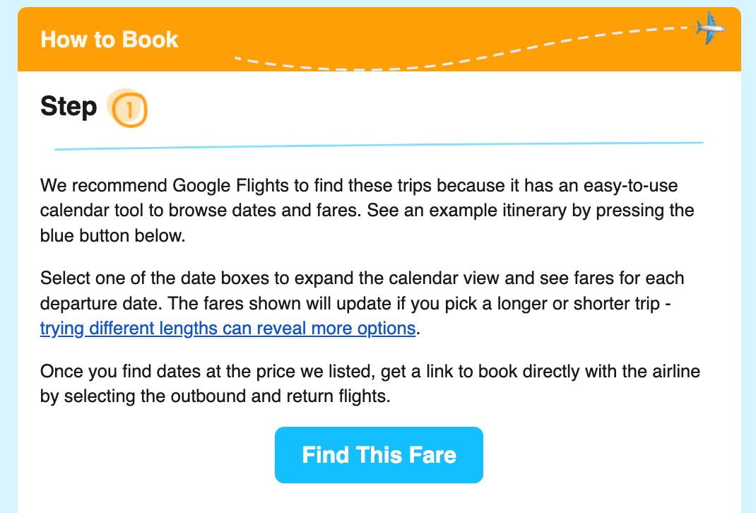 This is where we tell you exactly which websites are offering the fare and instructions on how to book it. Usually, this involves finding your dates on Google Flights by clicking the blue button, as shown in the example above.