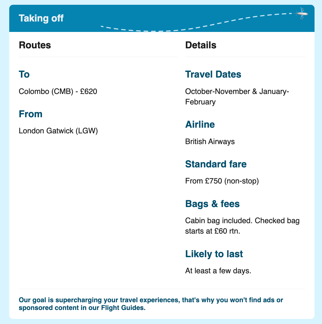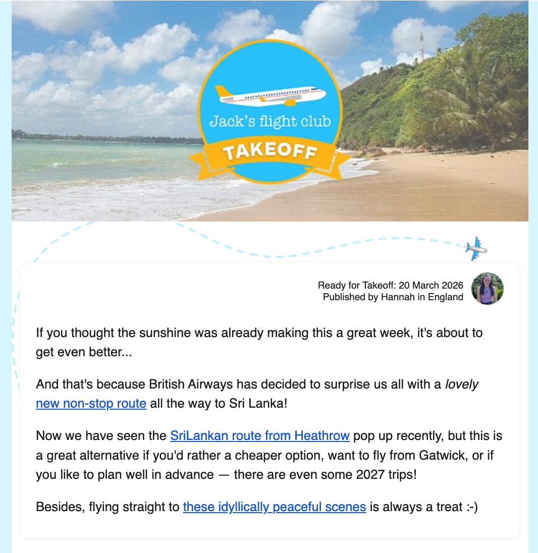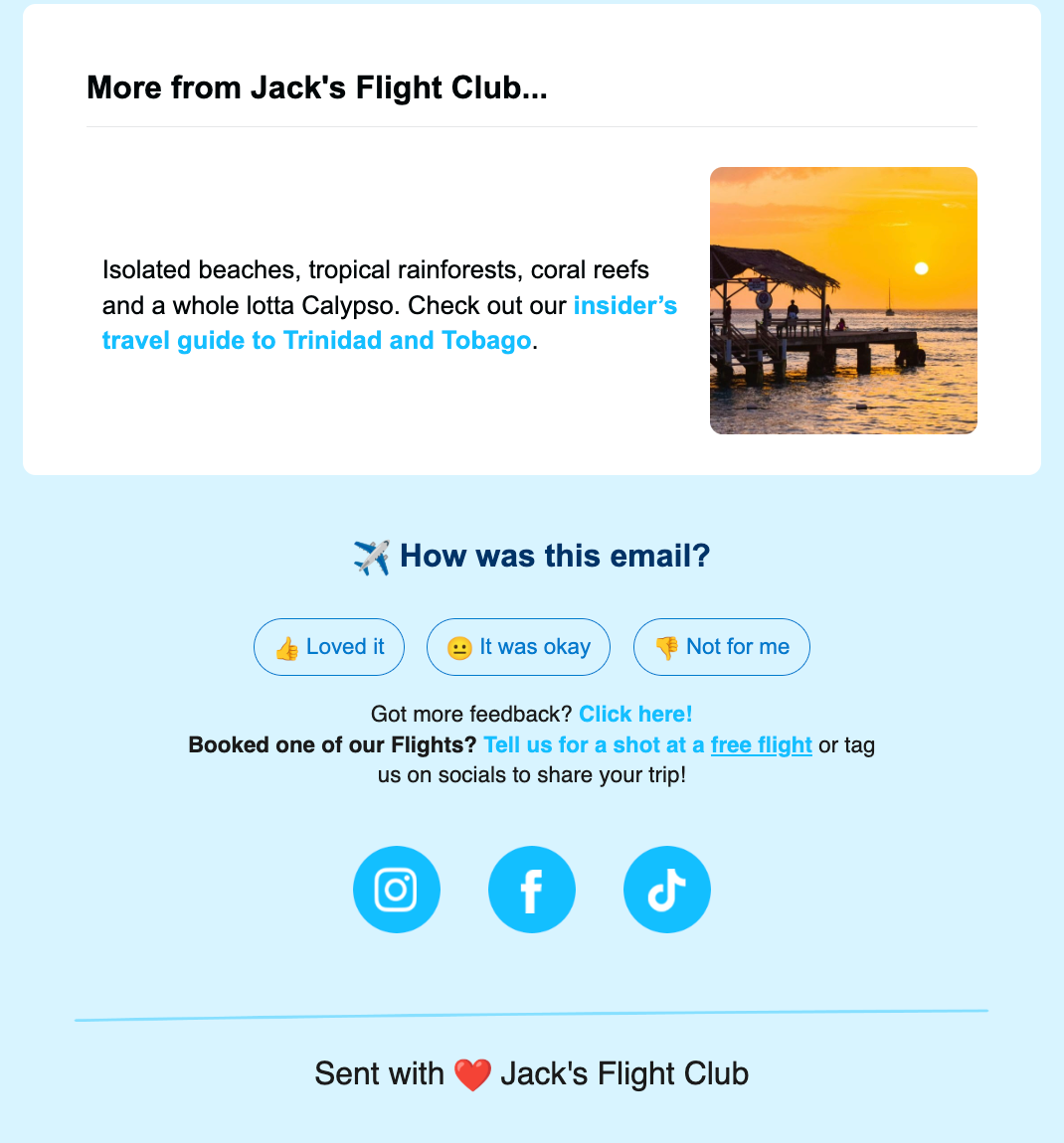 Here you’ll find a link to read more from our Navigators — we’ve got lots more articles on our website about different destinations, airlines, how to find cheap flights, and lots of other juicy nuggets of gold. You can also give us your feedback on the email by clicking on one of the emojis.